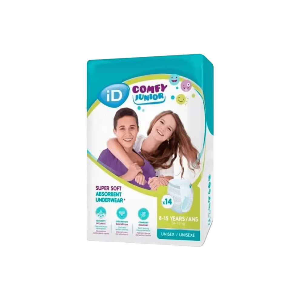 ID Comfy Junior Pants 8-15 Años Los ID Comfy Junior Pants son pañales tipo braguita diseñados específicamente para niños y adolescentes de 8 a 15 años. Ofrecen una solución discreta y cómoda para la incontinencia, con un ajuste elástico que se adapta a cinturas de 55 a 75 cm. Características principales: Comodidad y discreción: diseño tipo pantalón con cintura elástica para un ajuste seguro y similar a la ropa interior. Alta absorción: núcleo de celulosa con poliacrilato de sodio (SAP) para un control eficaz del olor y la humedad. Protección anti-fugas: barreras laterales hidrofóbicas y elásticos en la entrepierna para máxima seguridad. Materiales suaves: capas internas y externas de polipropileno y polietileno, suaves al tacto para el cuidado de la piel. Ideales para uso diario, proporcionando la confianza y protección que los jóvenes necesitan.