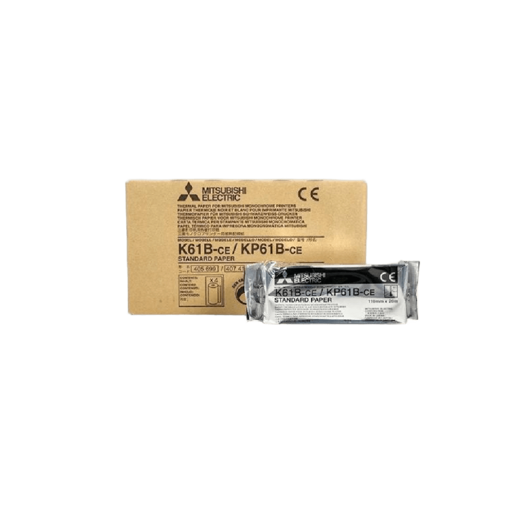El papel ecógrafo en rollo Mitsubishi K61B P-90 tiene un tamaño de 110 mm de ancho por 21 metros de largo. Este papel térmico es compatible con impresoras Mitsubishi y está diseñado para aplicaciones de ultrasonido y microscopía médica.