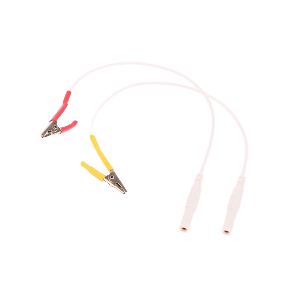 Pinza Cocodrilo con Cable – Conectores tipo banana 2 mm para equipos de electroestimulación Este juego de pinzas cocodrilo con cable está diseñado para su uso en dispositivos con conexión tipo banana de 2 mm, como equipos de electroestimulación o biofeedback. Cada pack incluye dos unidades, una en color rojo y otra en color amarillo, lo que facilita la identificación de canales. Las pinzas son pequeñas, ligeras y permiten una sujeción precisa y segura de electrodos o elementos de conducción. Con una longitud de cable de 90 mm, ofrecen una conexión cómoda y estable sin interferencias durante la terapia o medición. Características destacadas: • Pack de 2 cables con pinzas cocodrilo pequeñas • Conectores tipo banana de 2 mm • Longitud del cable: 90 mm • Colores: rojo y amarillo • Compatibles con equipos de electroestimulación, biofeedback y similares • Fáciles de usar y conectar • Uso profesional en fisioterapia, rehabilitación o diagnóstico