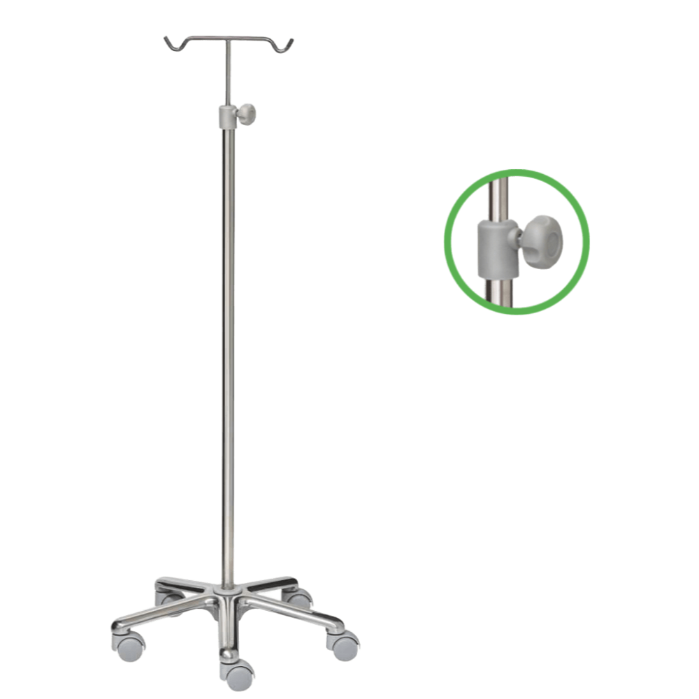 SOPORTE PORTASUERO ACERO CROMADO DOS COLGADORES C/ RUEDAS - UNIDAD Soporte portasueros de acero cromado con 2 colgadores y base con ruedas para un desplazamiento cómodo y seguro en entornos clínicos y hospitalarios.