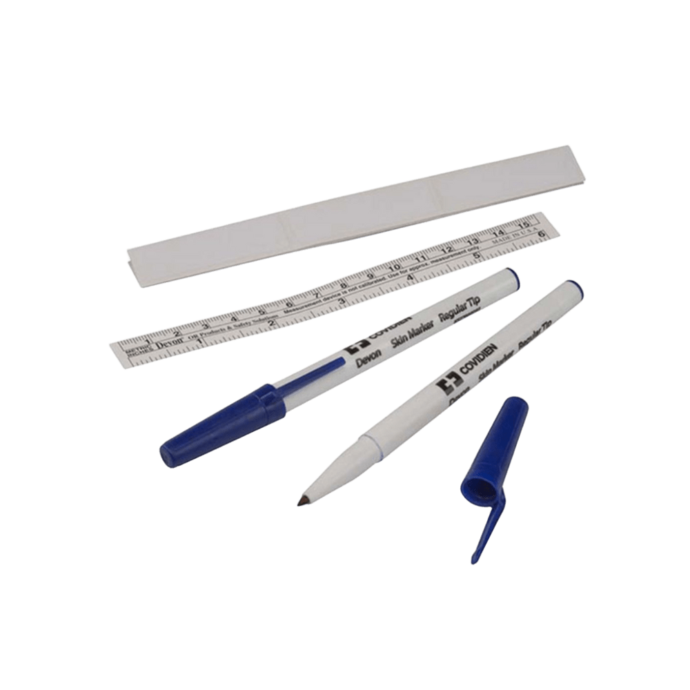 Marcadores Quirúrgicos de Punta Media con Regla Flexible – Precisión Estéril Rotuladores quirúrgicos estériles y libres de látex, con punta media y regla flexible integrada para marcar con exactitud zonas de corte e incisión en procedimientos médicos.
