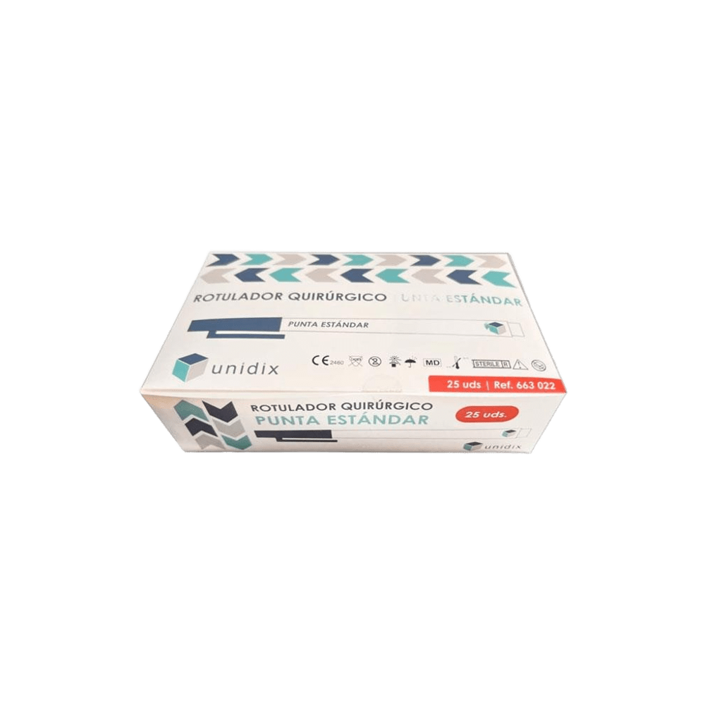 Rotulador Quirúrgico UNIDIX Punta Estándar – Señalización clara y segura para intervenciones médicas El Rotulador Quirúrgico UNIDIX Punta Estándar está diseñado para realizar marcaciones nítidas y seguras en la piel antes o durante procedimientos quirúrgicos, radiológicos o en la enseñanza médica. La punta estándar permite trazos bien definidos y visibles, adecuados para la delimitación de zonas quirúrgicas amplias o marcas generales preoperatorias. El producto es estéril mediante radiación Gamma, empaquetado individualmente, de un solo uso y fabricado en polipropileno (PP), libre de látex, garantizando la seguridad e higiene en el entorno médico. Incorpora además una regla flexible milimetrada de 15 cm para mayor precisión en las mediciones. Características destacadas: • Punta estándar para marcación clara y visible • Producto estéril (radiación Gamma), envasado individual • Fabricado en polipropileno (PP), libre de látex • Tinta líquida color morado de alta visibilidad • Incluye regla flexible milimetrada de 15 cm • De un solo uso, desechable • Ideal para cirugía, radiología, dermatología y docencia médica .