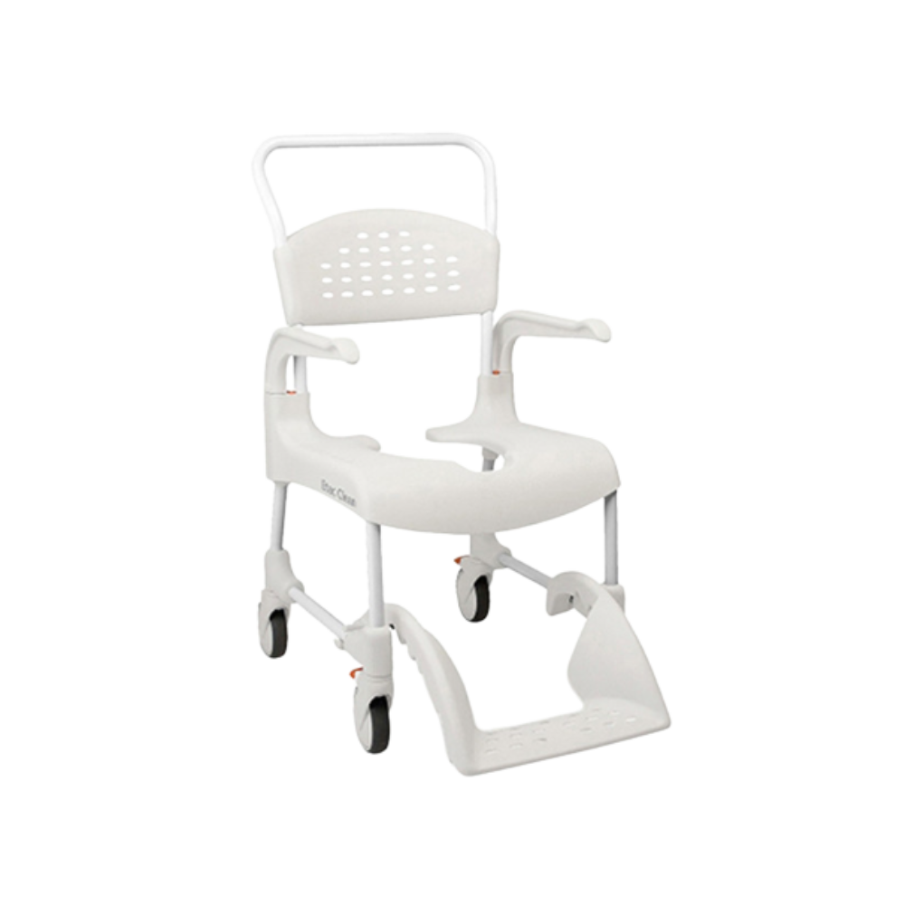 Silla ducha y W.C clean. Silla de ducha y WC blanca con asiento a 55 cm de altura, diseño ergonómico y seguro, equipada con ruedas con freno, reposabrazos abatibles y reposapiés escamoteables. Ideal para la higiene de personas con movilidad reducida, tanto en entornos domésticos como sanitarios.