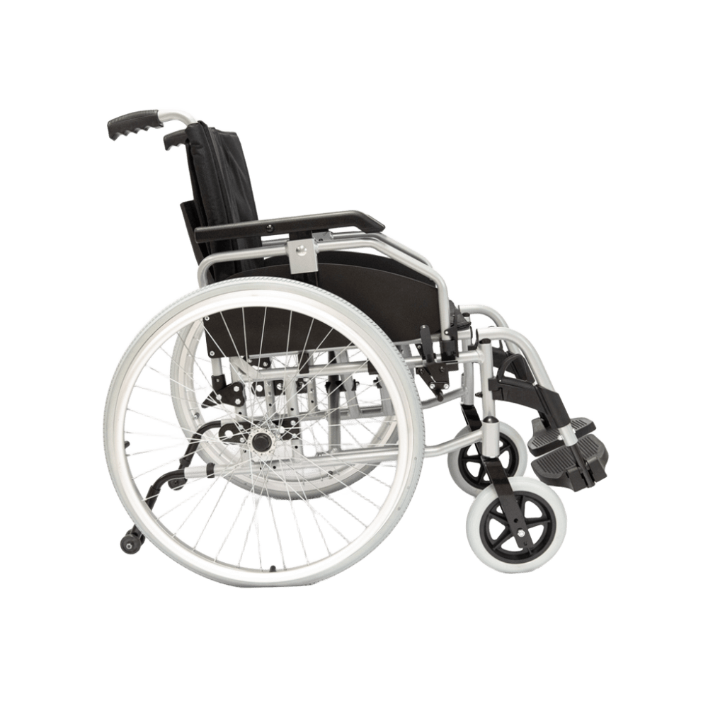 Esta silla de ruedas autopropulsable está construida en aluminio, lo que le proporciona una estructura ligera, resistente y fácil de maniobrar. Incorpora un sistema de extracción rápida en las ruedas traseras que facilita su transporte y almacenamiento, mientras que las ruedas delanteras de poliuretano ofrecen un desplazamiento suave y sin mantenimiento. Los reposabrazos son abatibles, extraíbles y regulables tanto en altura como en profundidad, permitiendo al usuario encontrar la posición más cómoda y favorecer la correcta utilización de cojines posturales o antiescaras. Los reposapiés también son abatibles y extraíbles, con ajuste de altura y ángulo para adaptarse a diferentes necesidades de apoyo y posicionamiento. El respaldo cuenta con un tensor que permite ajustar la tensión para mejorar la estabilidad del tronco y corregir el efecto hamaca, proporcionando así una postura más confortable y ergonómica. Además, incluye sistema antivuelco para aumentar la seguridad durante la autopropulsión. En conjunto, se trata de una silla versátil, cómoda y altamente configurable, ideal para usuarios que buscan una solución ligera, segura y ajustable para su movilidad diaria.