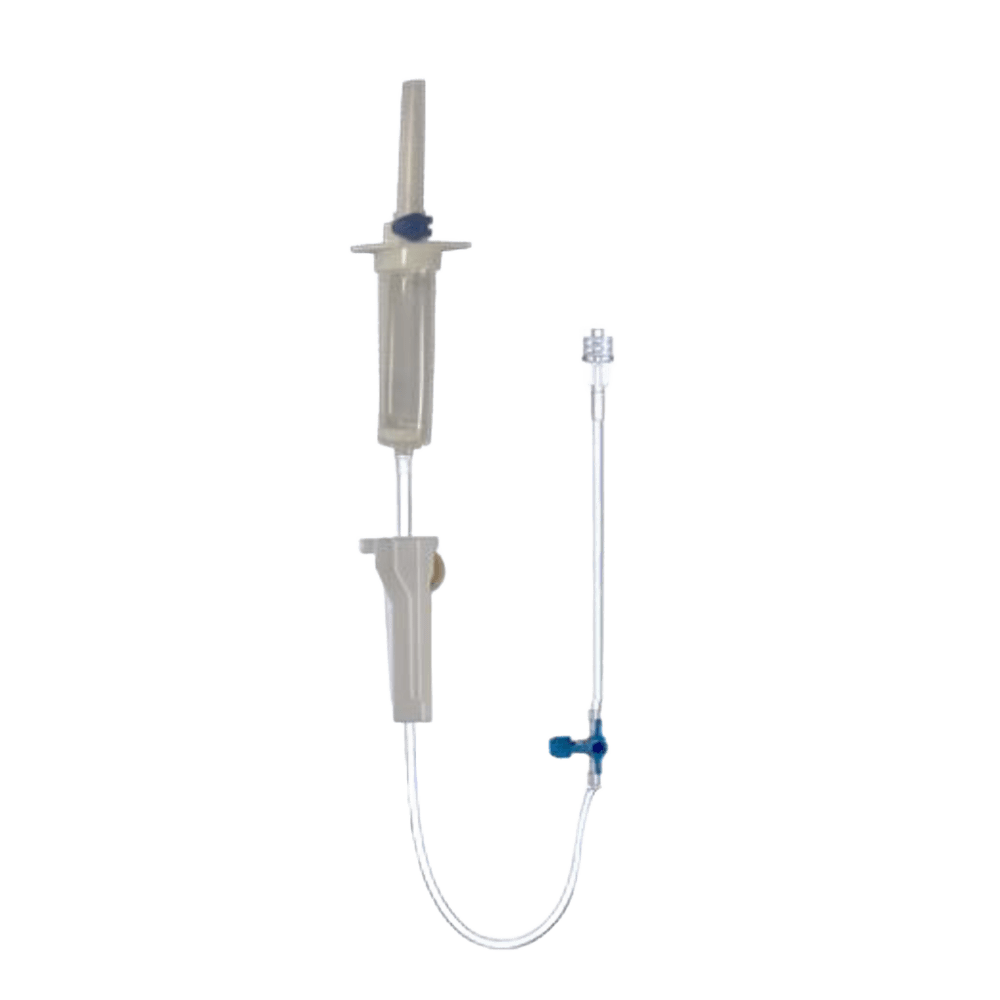 Sistema de Suero con Toma de Aire, Filtro y Llave de 3 Vías “Polymed” – Infusión intravenosa segura y versátil El sistema de suero “Polymed” está diseñado para la administración de soluciones intravenosas por gravedad, incorporando una llave de 3 vías lipidoresistente para facilitar conexiones adicionales o infusión múltiple desde una misma vía. Incluye una toma de aire con filtro hidrofóbico de retención microbiana, ideal para usar con bolsas o botellas de vidrio. La cámara de goteo, transparente, presenta un rendimiento de 20 gotas = 1 ml y cuenta con un filtro de 15 μm para retención de partículas. La llave de 3 vías, en color azul, es giratoria 360°, con bordes redondeados e indicadores de flujo, lo que permite una manipulación segura y controlada. El regulador tipo roller permite ajustar con precisión la velocidad de infusión, mientras que el tubo de 160 cm es flexible, sin memoria y antiacodable. En el extremo distal, cuenta con conexión macho Luer-lock con tapón protector y filtro de purga, facilitando el cebado del sistema sin contaminación. Producto estéril, de un solo uso, 100% libre de látex y DEHP. Características destacadas: • Cámara de macrogoteo: 20 gotas = 1 ml • Filtro de 15 μm en cámara de goteo • Toma de aire con filtro microbiano y apertura regulable • Llave de 3 vías giratoria 360°, lipidoresistente • Tubo de 160 cm – flexible, transparente, antiacodable • Regulador de flujo tipo roller con anclaje • Conexión Luer-lock macho con tapón y filtro de purga • Materiales: PVC, ABS, PP .