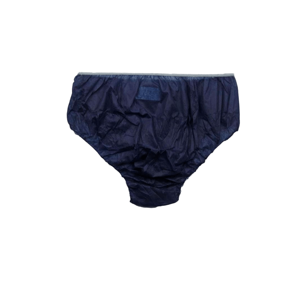 Slip desechable caballero – Caja 50 uds Tejido no tejido azul marino, hipoalergénico, embolsado individualmente. Con refuerzo delantero y gomas de ajuste.