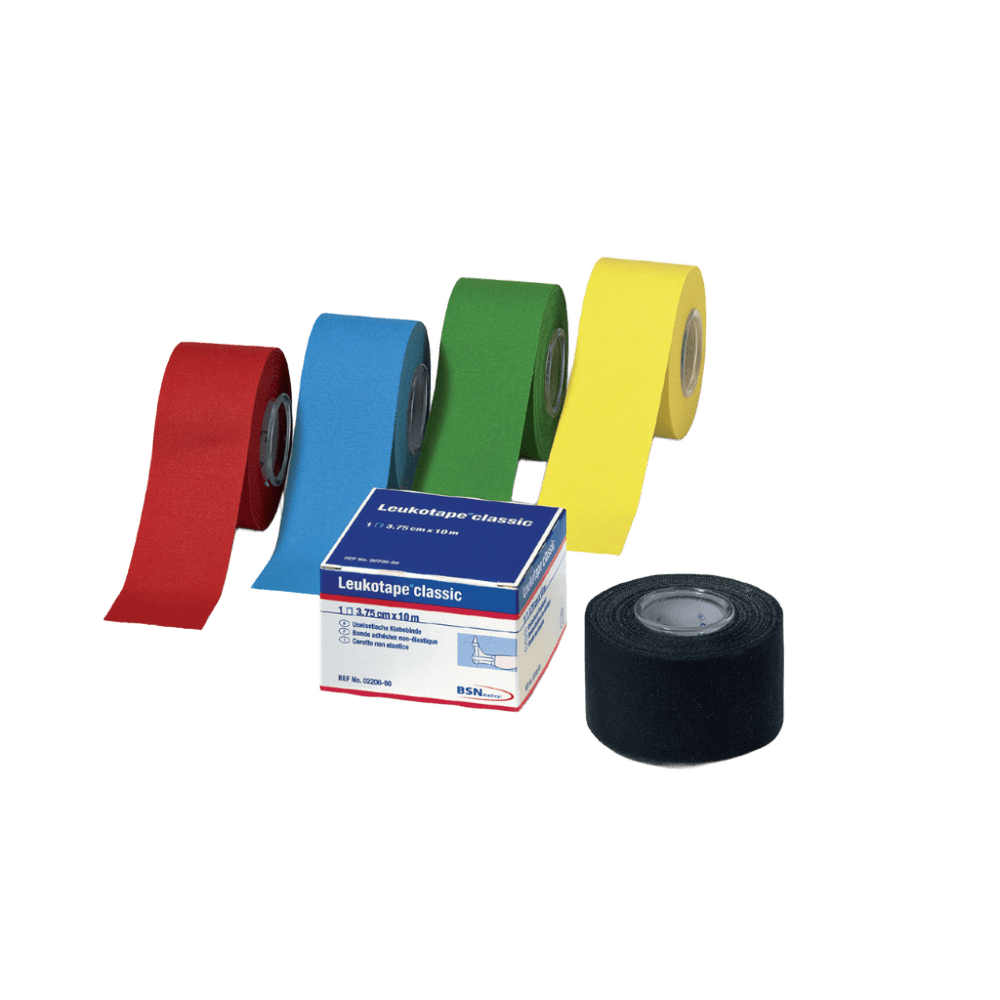 Cinta Adhesiva Inelástica de Colores para Vendaje Funcional Cinta específica para vendajes funcionales en el tratamiento y prevención de lesiones musculares y articulares leves o moderadas. Indicada para aplicaciones en fisioterapia, medicina deportiva, rehabilitación y traumatología. Características y Beneficios • Fuerte adhesividad para una sujeción segura y duradera • Inelástica, limita selectivamente el movimiento según técnica de vendaje • Rasgable a mano en ambas direcciones, rápida y fácil de aplicar • Tejido tipo tafetán, gran resistencia y soporte • Repele el agua gracias a su acabado hidrófugo • Incluye canutillo plástico para desenrollado cómodo y aplicación precisa • Disponible en 5 colores: azul, rojo, verde, amarillo y negro .