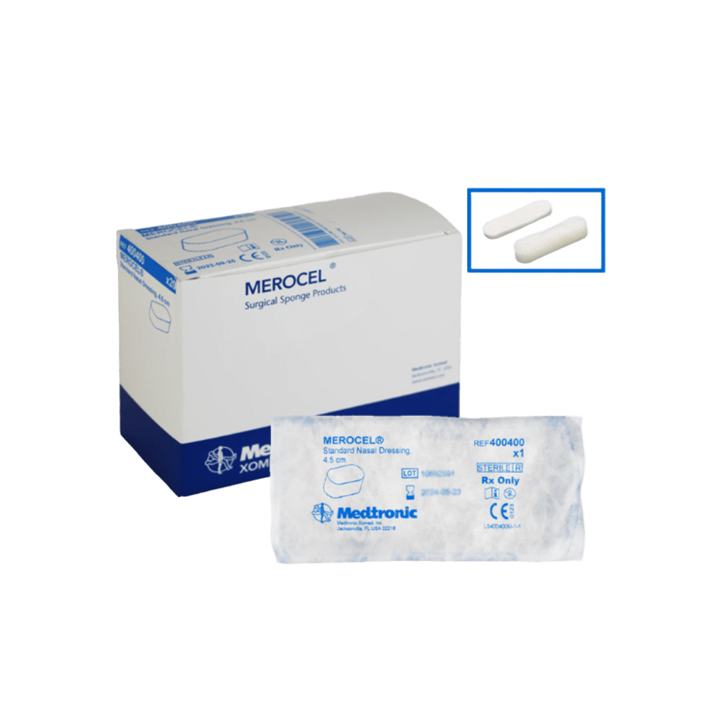Compresa Nasal Merocel 4,5 × 1,5 cm con Cordón – Caja x10 Uds Taponamiento nasal estéril de acetato de polivinilo con celulosa oxidada. Alta absorción, control de epistaxis y extracción atraumática. Ideal para cirugía nasal. Con cordón para fácil retirada.