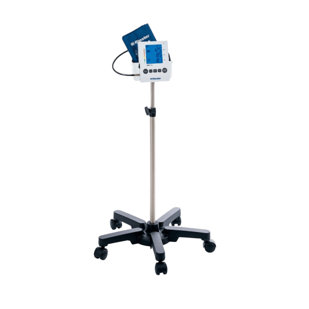 Tensiómetro Rodable Riester Tensiómetro con carro ajustable (75-120 cm), medición manual y oscilométrica. Pantalla LCD de 4, memoria de 210 mediciones y detección de arritmias. Precisión del pulso +/- 5%.