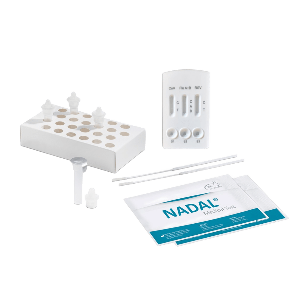 Test rápido inmunocromatográfico combinado para detección cualitativa de antígenos de SARS-CoV-2, Influenza A y B, y virus respiratorio sincitial (VRS) en hisopado nasofaríngeo. Resultados fiables y fáciles de interpretar en 15 minutos, sin reacciones cruzadas, sensibilidad superior al 94% y especificidad mayor al 98%. Incluye 20 test cassettes, hisopos y tubos con buffer. Solo para uso profesional, ideal para diagnóstico diferencial en entornos clínicos