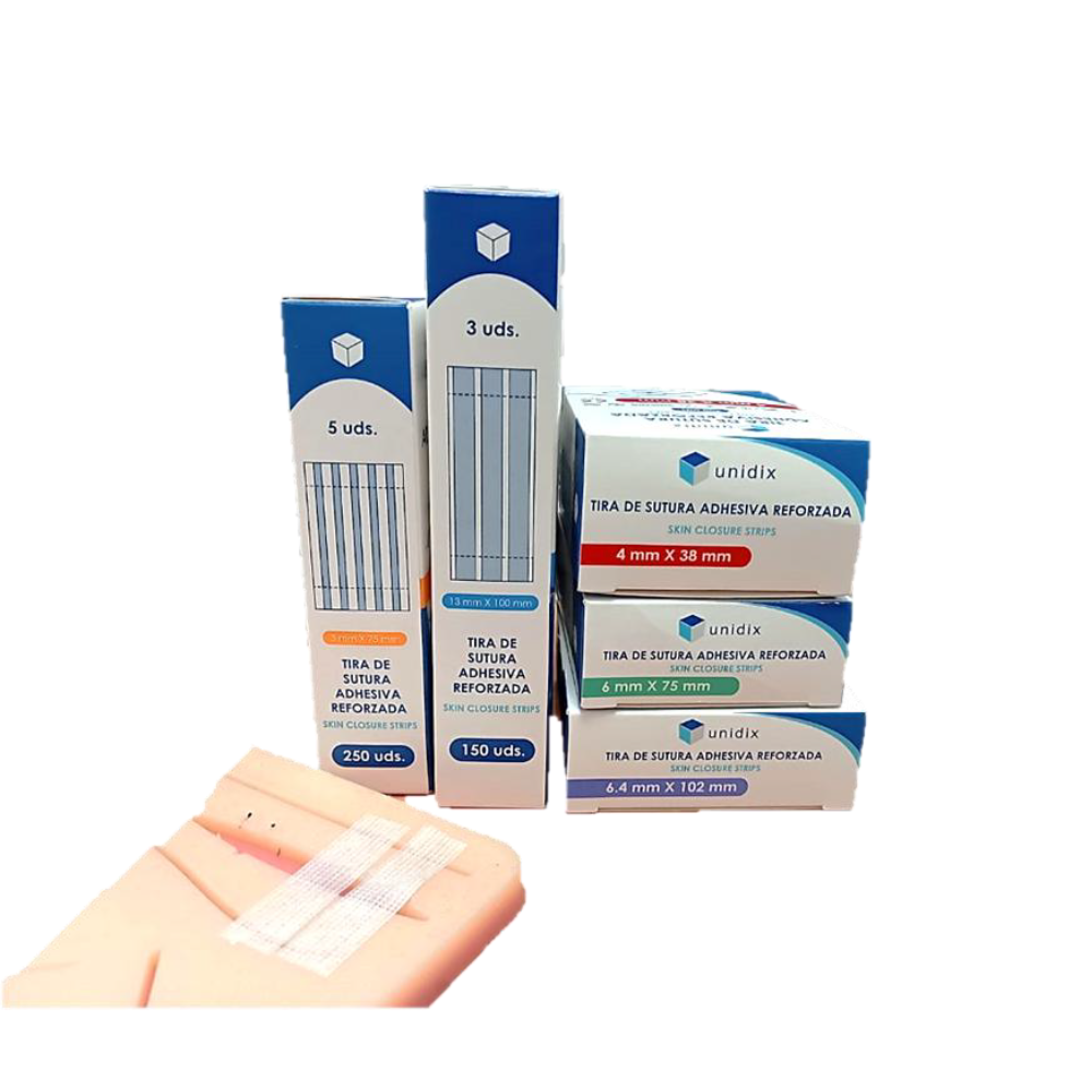 Tira sutura adhesiva reforzada Unidix. Tiras adhesivas cutáneas estériles, reforzadas y hipoalergénicas, diseñadas para el cierre atraumático de heridas, cortes e incisiones quirúrgicas. Mantienen unidos los bordes de la piel favoreciendo una cicatrización rápida, segura y con mejor resultado estético.