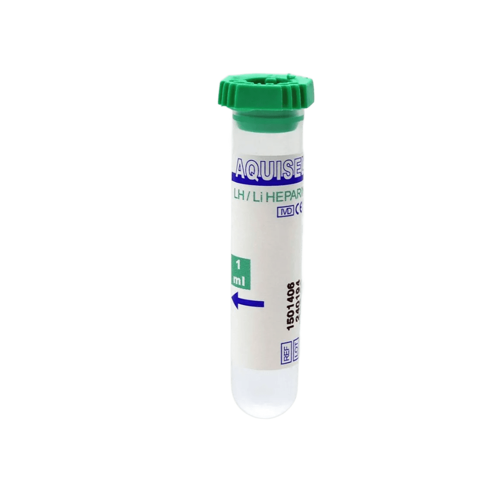 Tubo Aquisel heparina. Tubo de extracción de sangre con aditivo Heparina de Litio (LH), color verde, con capacidad de 1 mL. Anticoagulante de acción rápida, recomendado para bioquímica clínica y servicios de urgencias.