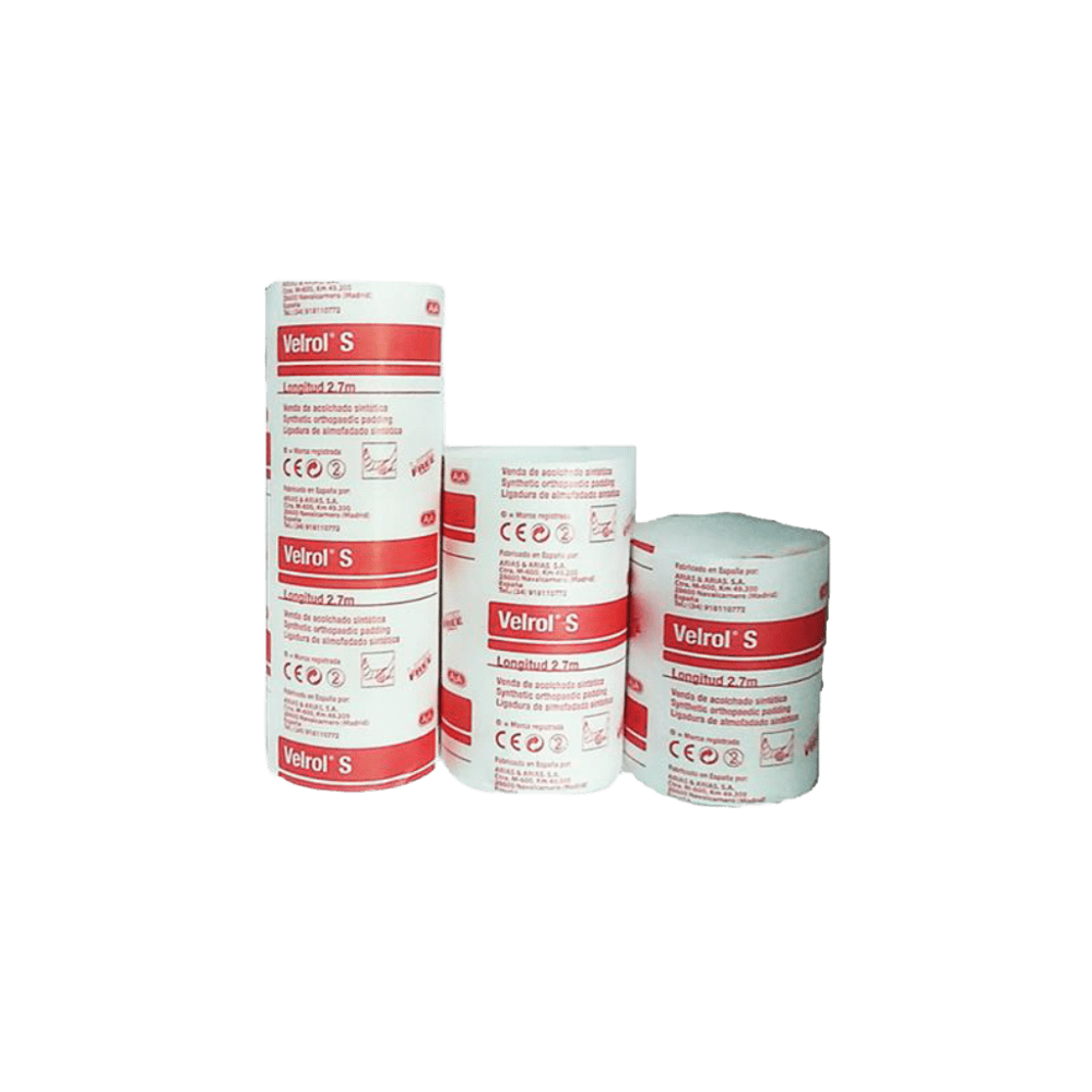 Venda Almohadillado Velrol S–Caja de 12 Uds Venda de acolchado de fibra virgen de poliéster 100%, sin bi-componentes, diseñada para proteger la piel y prominencias óseas bajo moldes ortopédicos y vendajes adhesivos o compresivos de uso prolongado.