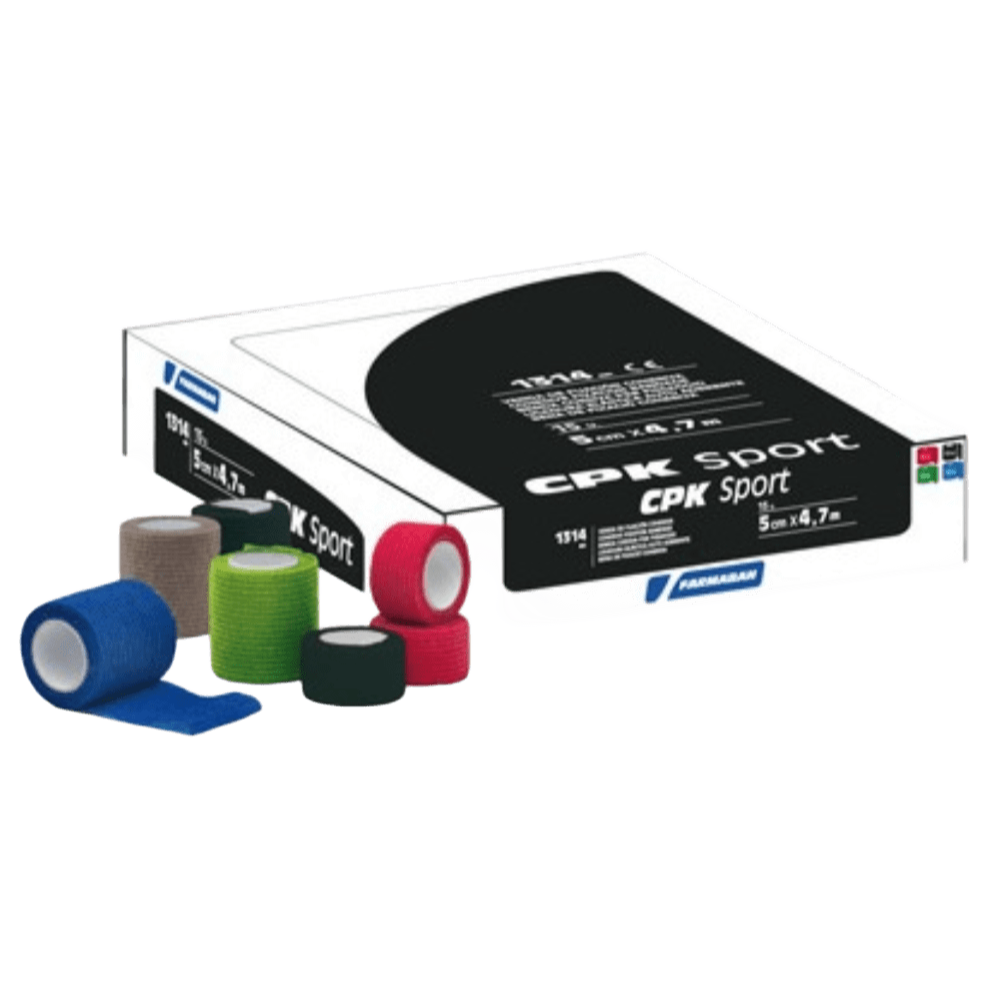 Venda CPK SPORTS.- Caja. Venda cohesiva elástica sin látex, que se adhiere solo sobre sí misma, ideal para vendajes deportivos y soporte muscular. Fácil de aplicar, transpirable, antideslizante y disponible en varios colores.