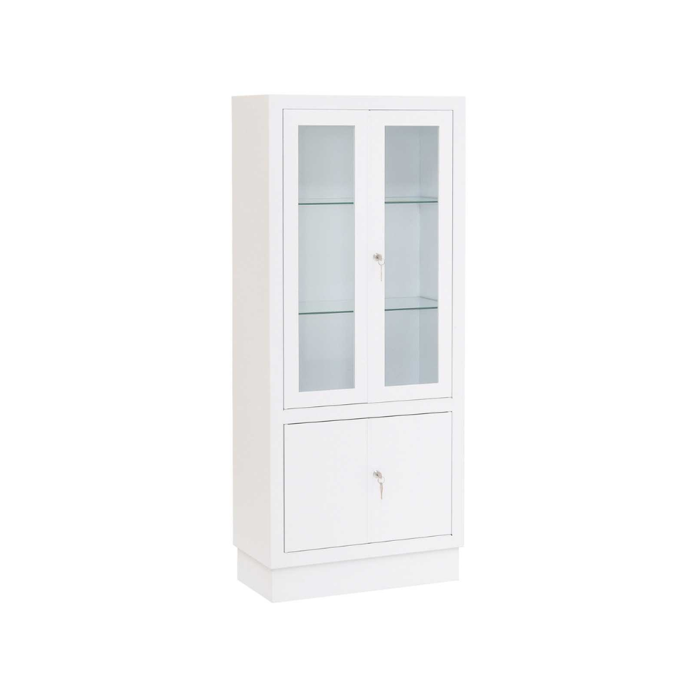 Vitrina armario acero pintado. Vitrina clínica fabricada en acero con revestimiento epoxy, diseñada para ofrecer almacenamiento seguro y organizado. Incorpora puertas de cristal con cerradura en la parte superior, estantes fijos y un compartimento inferior metálico también con cerradura. Con 140 cm de altura y dimensiones compactas, es ideal para consultorios y espacios sanitarios.