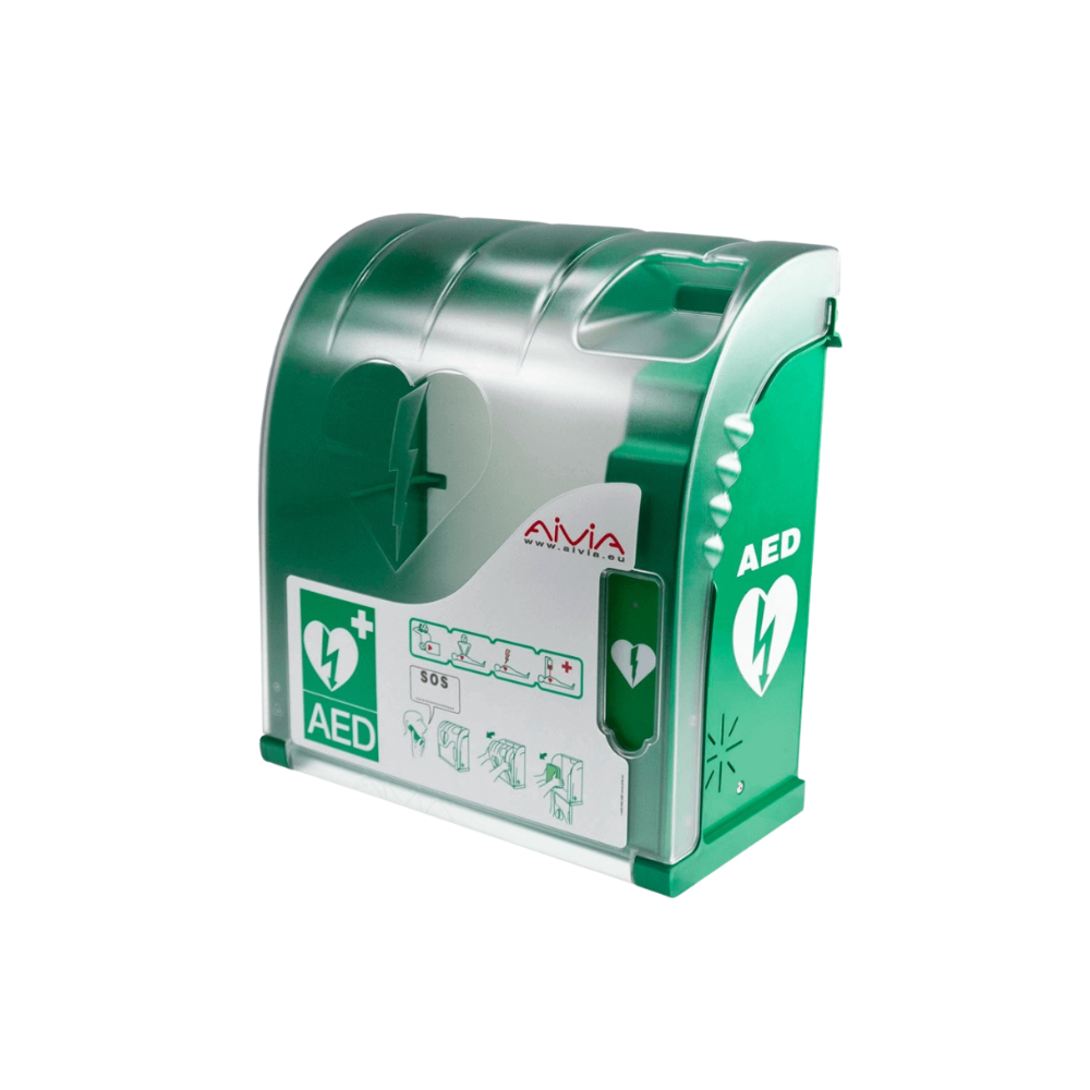 AIVIA 100 – Vitrina cerrada con luz y alarma para desfibrilador AED Vitrina ligera, compacta y resistente para alojar cualquier DEA. Incluye alarma visual y sonora con 3 años de autonomía. Instalación rápida sin herramientas.